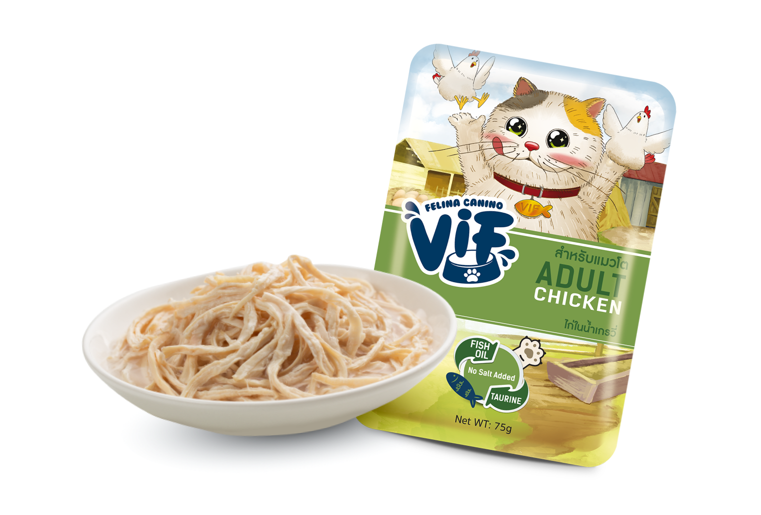 เนื้อไก่แน่นในน้ำเกรวี่หอมอร่อย ทานง่ายเหมาะสำหรับแมวโตเต็มวัย เสริมด้วยน้ำมันปลา และทอรีน ที่ช่วยส่งเสริมสมดุลการทำงานของร่างกาย ไม่ใส่เกลือและสารกันเสีย