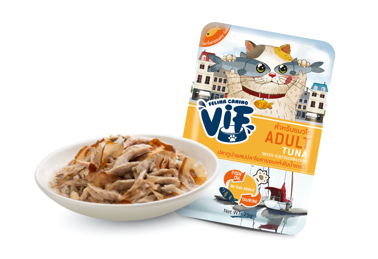 เนื้อปลาทูน่าและปลาโอลายรสชาติเข้มข้นในน้ำเกรวี่หอมอร่อย ทานง่ายเหมาะสำหรับแมวโตเต็มวัย เสริมด้วยน้ำมันปลา และทอรีน ที่ช่วยส่งเสริมสมดุลการทำงานของร่างกาย ไม่ใส่เกลือและสารกันเสีย