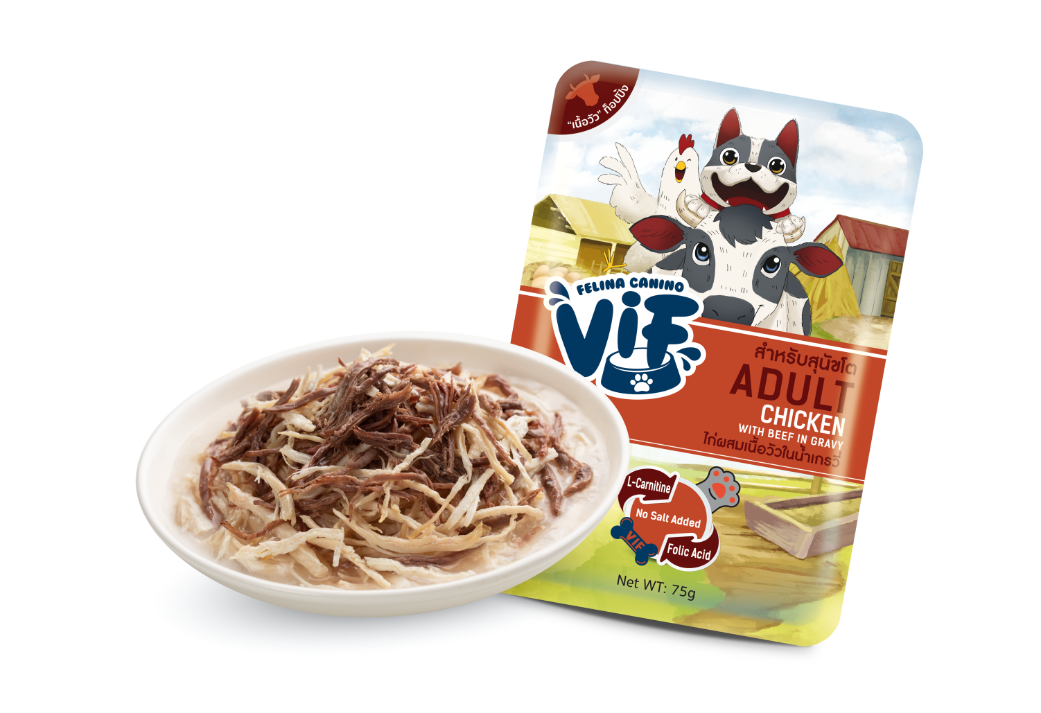 ผสานรสชาติเข้มข้นจากเนื้อวัวและสัมผัสนุ่มแน่นจากเนื้อไก่ ในน้ำเกรวี่หอมอร่อย ทานง่ายเหมาะสำหรับสุนัขโตเต็มวัย เสริมด้วยแอลคาร์นิทีนและกรดโฟลิก ที่ช่วยส่งเสริมสมดุลการทำงานของร่างกาย ไม่ใส่เกลือและสารกันเสีย