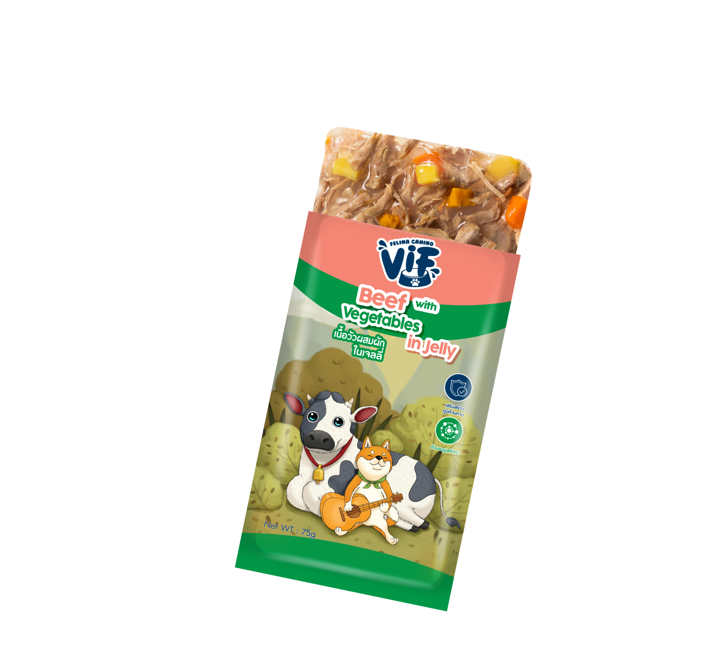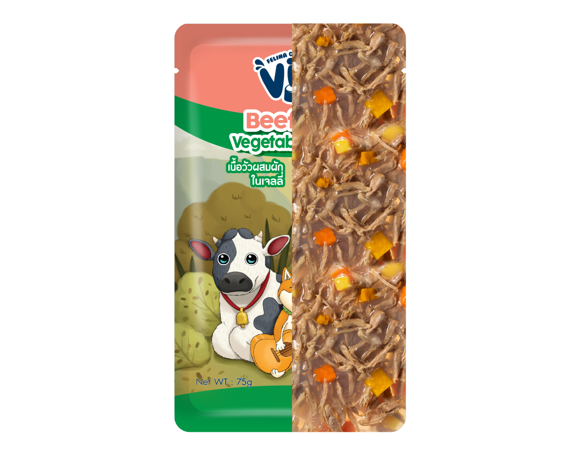 อัดแน่นสารอาหารทั้งจากเนื้อวัวรสชาติเข้มข้นและผักกรุบกรอบ อยู่ในรูปแบบเจลลี่เนื้อเนียนนุ่ม อิ่มอร่อยได้แม้ไม่มีการผสมเกลือและสารกันเสีย และเสริมด้วย โอลิโกฟรุกโตส โคเอนไซม์คิว10 และ วิตามินซี ที่มีส่วนช่วยให้การทำงานของร่างกายแข็งแรง