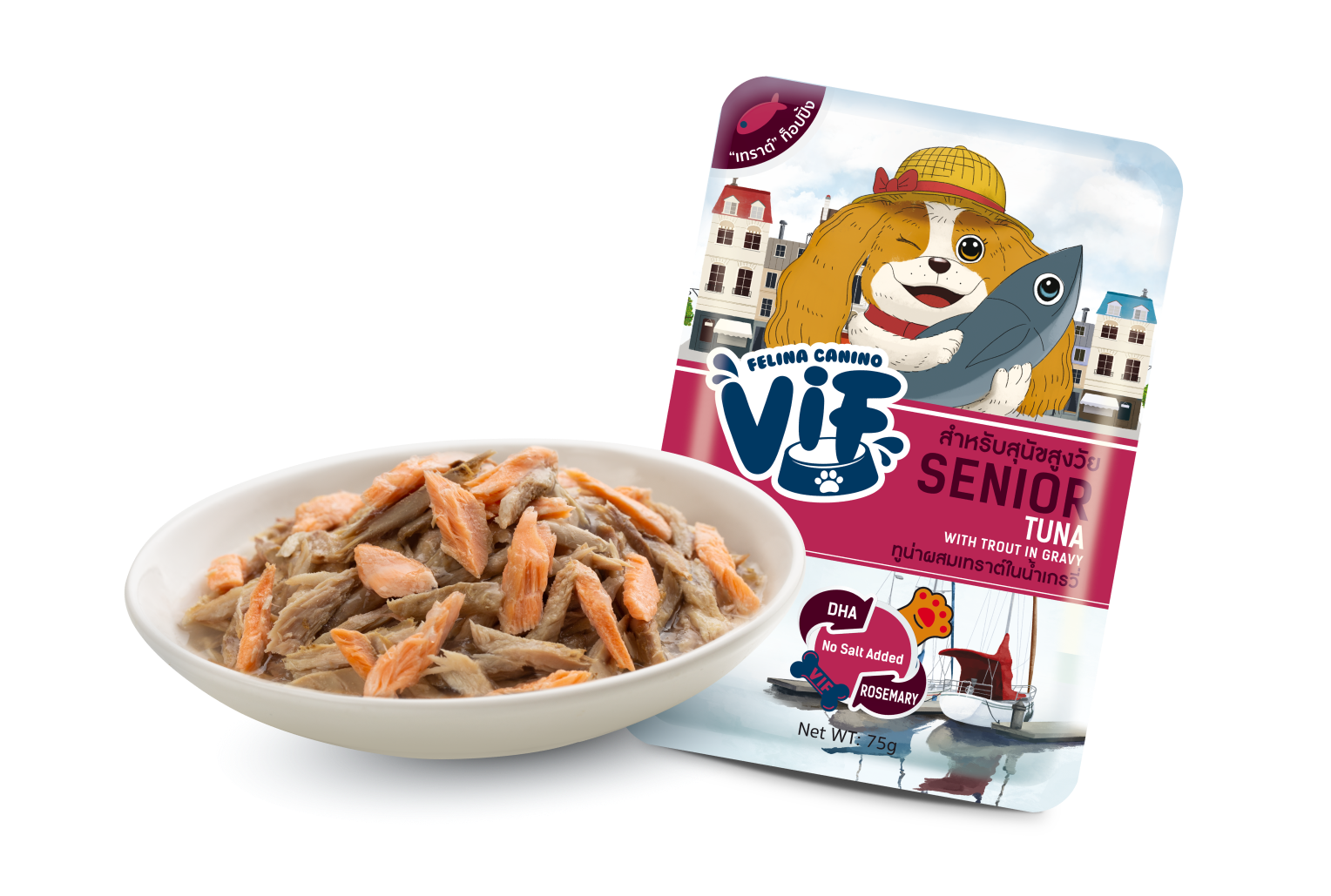 เนื้อปลาทูน่าผสมผสานกับเนื้อปลาเทราต์รสชาติเข้มข้น ในน้ำเกรวี่หอมอร่อย ทานง่ายเหมาะสำหรับสุนัขสูงวัย อีกทั้งมีการเสริม DHA และสารสกัดโรสแมรี่ สารอาหารที่ช่วยส่งเสริมสมดุลการทำงานของร่างกายให้กับสุนัขสูงวัย ไม่ใส่เกลือและสารกันเสีย