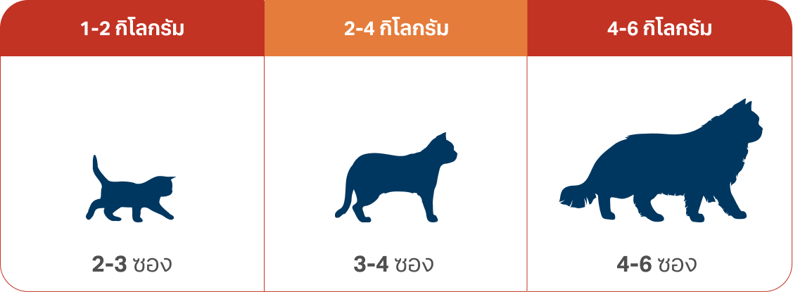 • ปริมาณอาหารปรับเปลี่ยนได้ตามความเหมาะสมของสายพันธุ์ น้ำหนัก และกิจกรรมของแมว