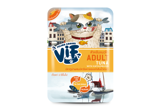 C6 ปลาทูน่าผสมปลาโอลายอบแห้ง ในน้ำเกรวี่ สำหรับแมวโต