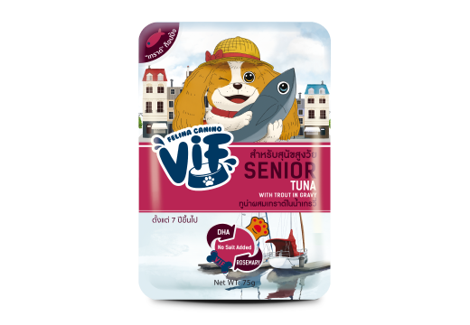 E3 ปลาทูน่าผสมปลาเทราต์ในน้ำเกรวี่ สำหรับสุนัขสูงวัย